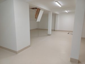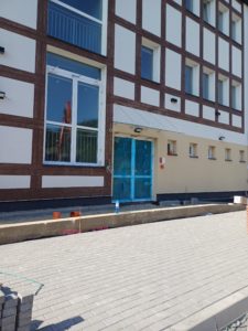 Wokół budynku uporządkowano i przebudowano układ komunikacji pieszej i kołowej, zapewniono utwardzone dojścia, strefę wejściową, elementy małej architektury oraz miejsce gromadzenia odpadów z zachowaniem zasad segregacji. Zaprojektowano również 2 miejsca postojowe dla osób z niepełnosprawnościami oraz nowe elementy ogrodzenia, bramę przesuwną i furtkę.