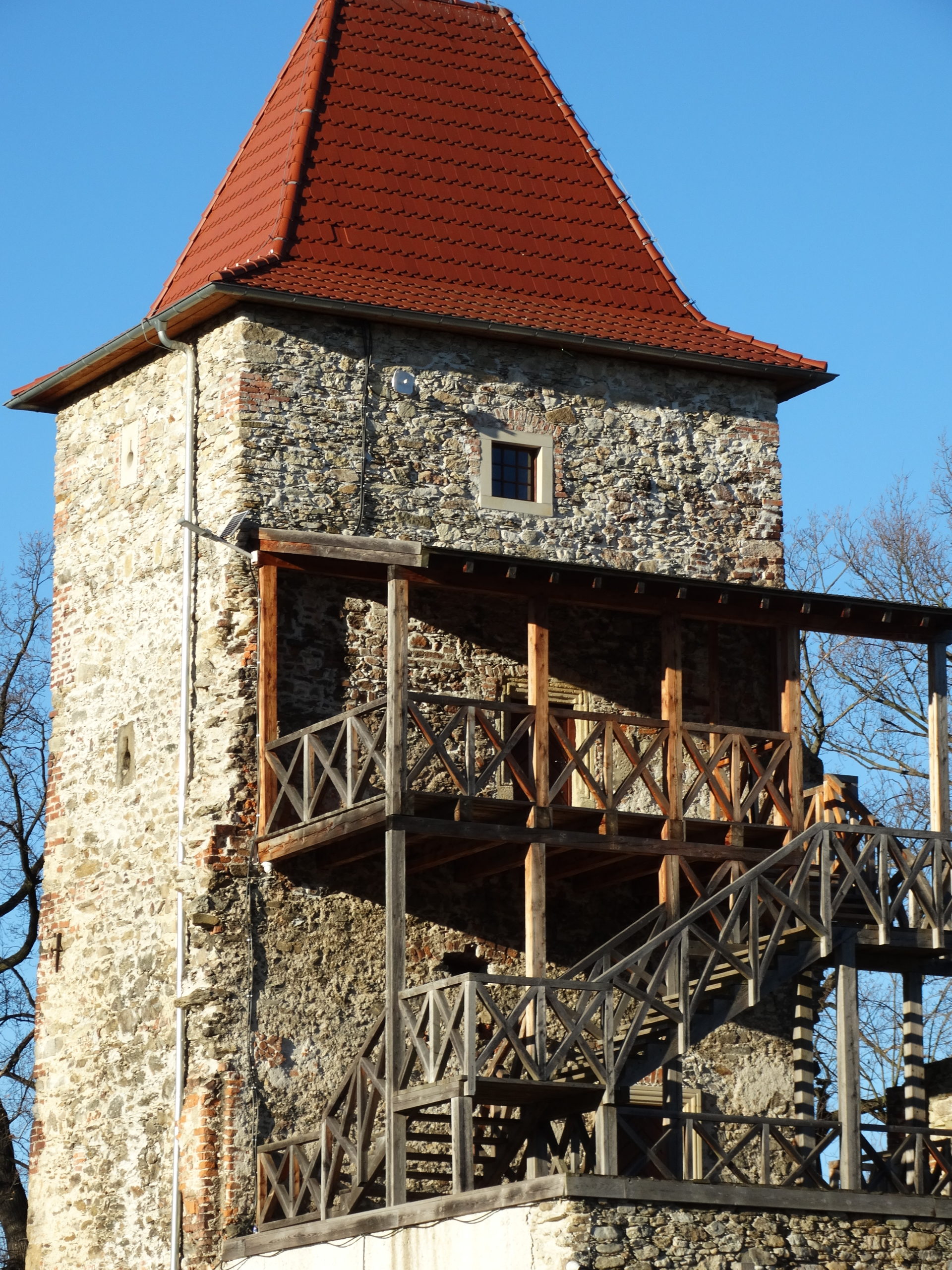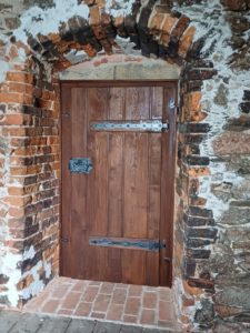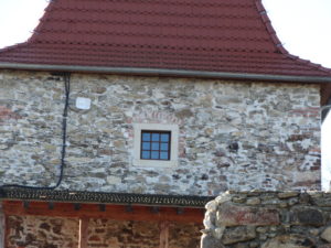 Równolegle zrealizowano rekonstrukcję stolarki okiennej i drzwiowej na wieży zamkowej. Zakres prac obejmował wykonanie czterech drewnianych okien o profilach historycznych, z podziałami i bezpiecznym szkleniem, a także trzech stylizowanych drzwi drewnianych, wzorowanych na formach z XVI wieku. Prace uwzględniały również odtworzenie kamiennych obramień okiennych z piaskowca, z maksymalnym wykorzystaniem zachowanych fragmentów oryginalnych, a także zabezpieczenie istniejących parapetów i tynków wewnętrznych.Zastosowane r ozwiązania materiałowe i detale architektoniczne – w tym kute okucia metalowe – zostały dobrane w taki sposób, aby jak najwierniej oddać charakter epoki i jednocześnie spełnić współczesne wymagania konserwatorskie.