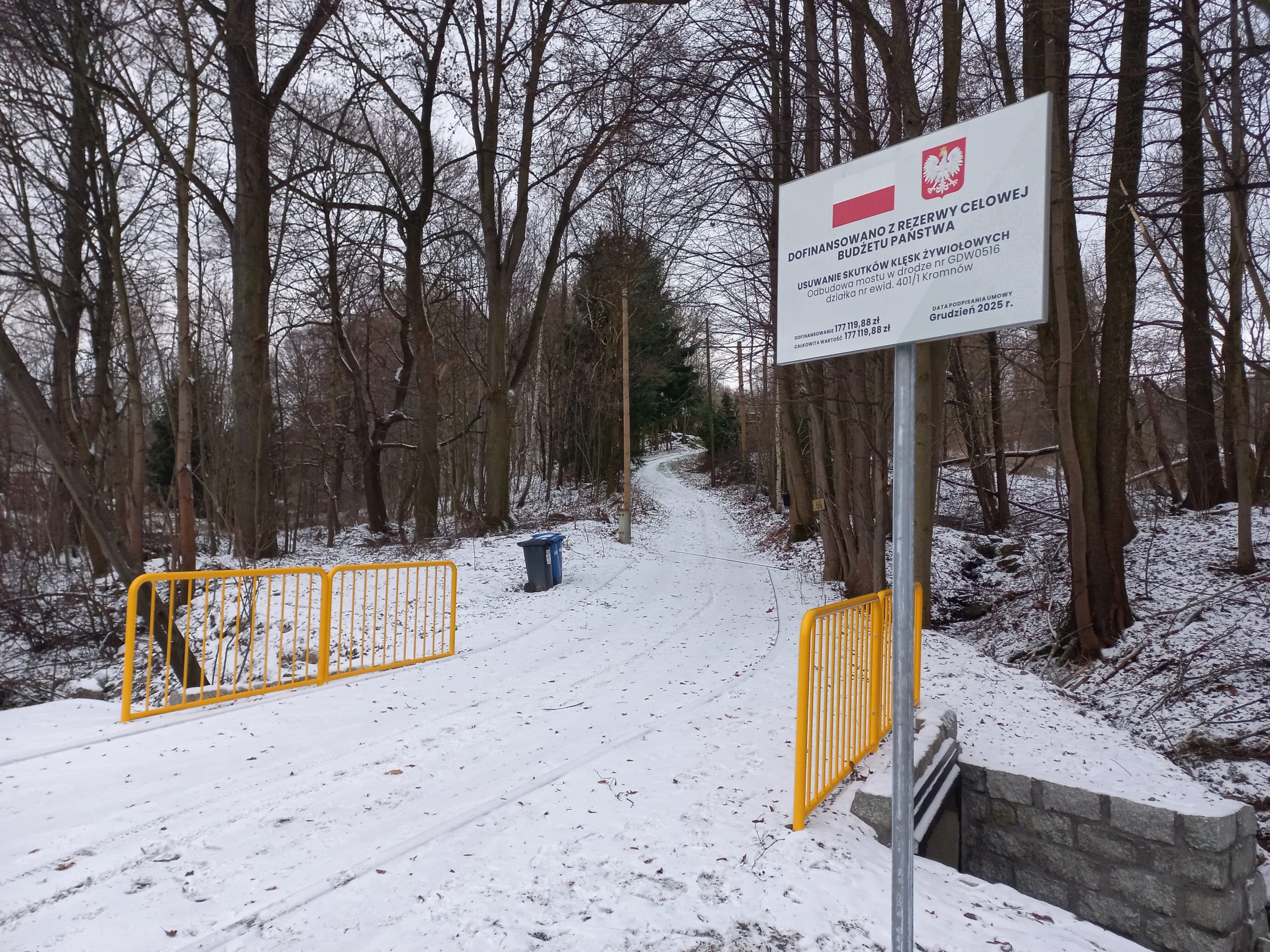Gmina Stara Kamienica zakończyła realizację kolejnej inwestycji związanej z usuwaniem skutków powodzi, która we wrześniu 2024 roku dotknęła nasz region. Tym razem prace objęły odbudowę przeprawy w ciągu drogi gminnej wewnętrznej nr GDW0516 w miejscowości Kromnów, na działce nr 401/1.